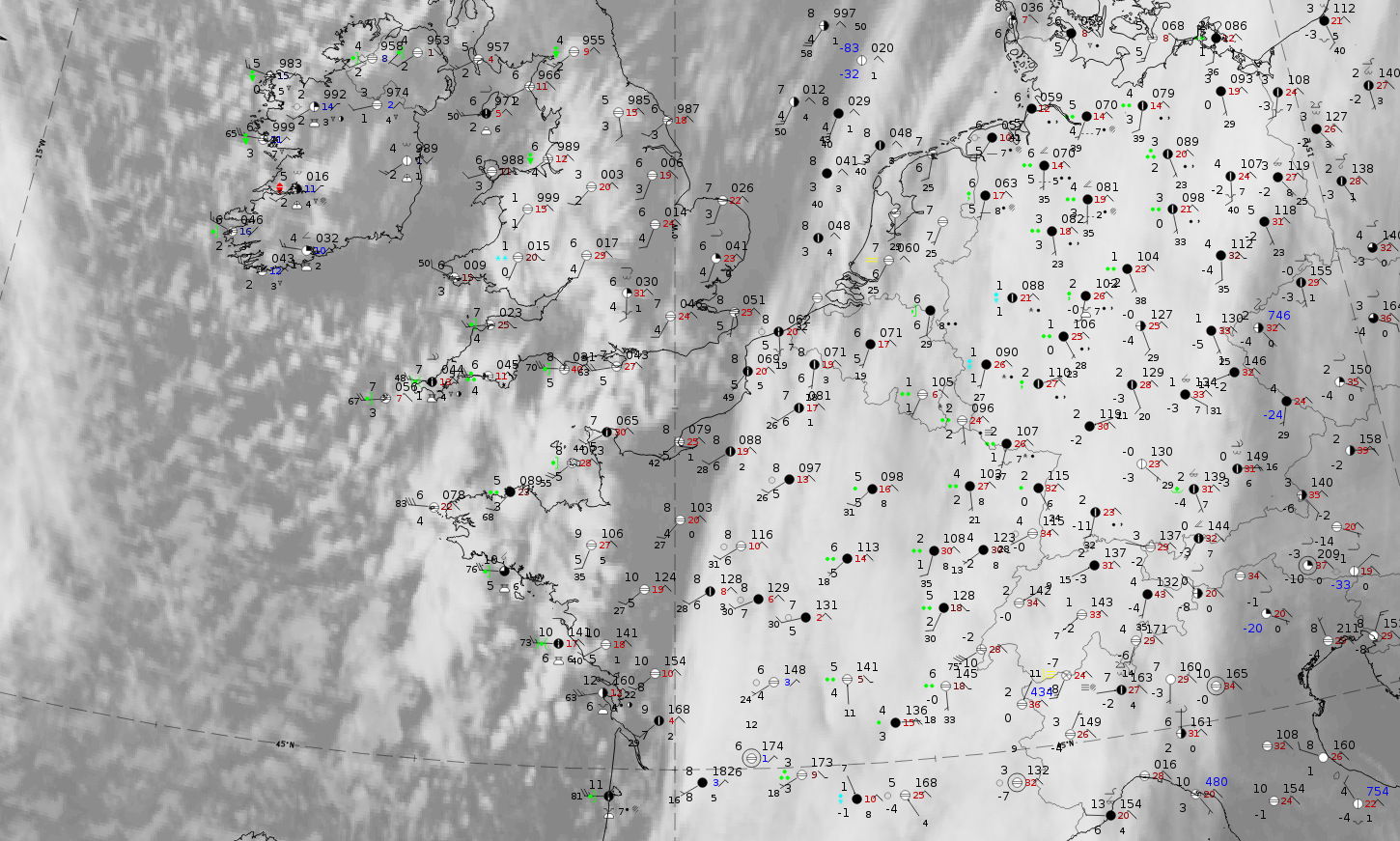 There are widespread reports of Cbs, showers and heavy rain; an area of maximum activity occurs from Cornwall to Brittany. In the southern part, cells occur with precipitation probabilities higher than 55%; however, some caution must be taken with the interpretation as a horizontal stripe over France separates different intensity groups, so a possibility of a computer problem here cannot be excluded.