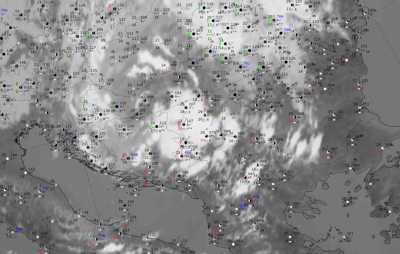 IR + synoptic measurements (above) + probability of moderate rain (Precipitting clouds PC - NWCSAF).
