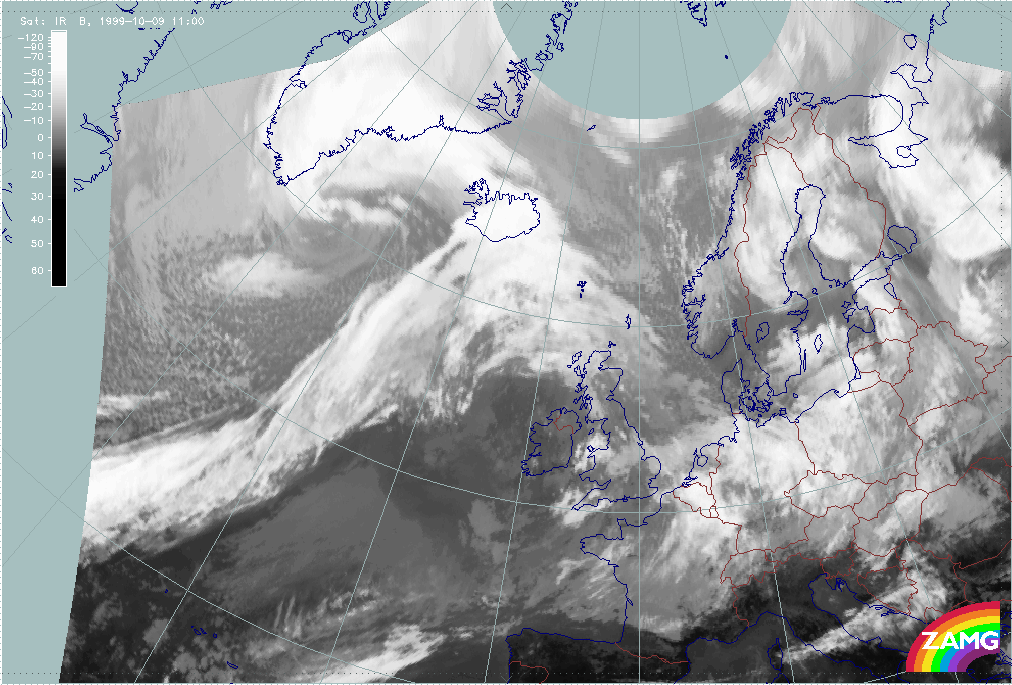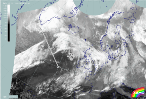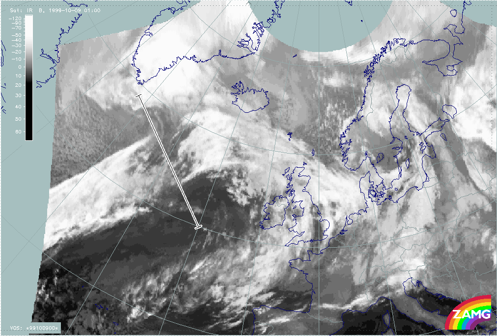 09 October 1999/01.00 UTC - Meteosat IR image; position of vertical cross section indicated