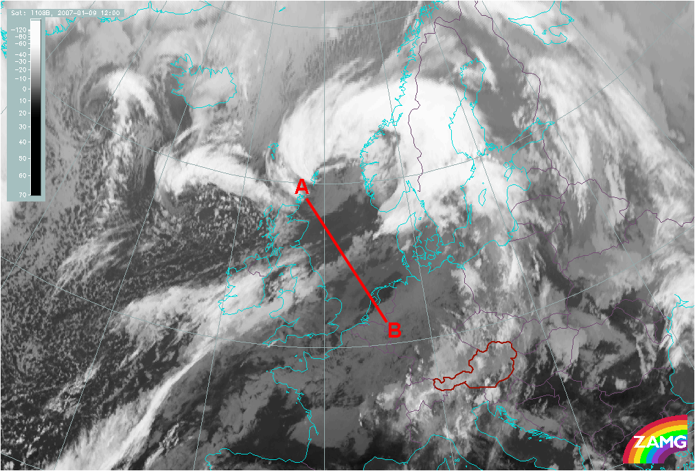 09 January 2007/12.00 UTC - Meteosat 8 IR10.8 image; position of vertical cross section indicated