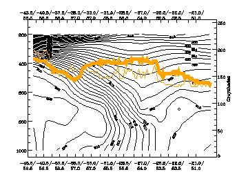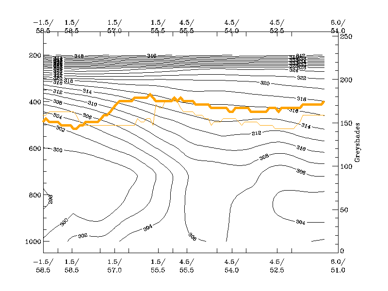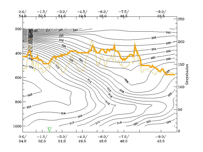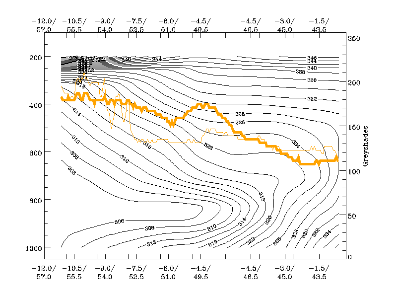 28 August 2006/06.00 UTC - Vertical cross section; black: isentropes (ThetaE), orange thin: IR pixel values, orange thick: WV pixel