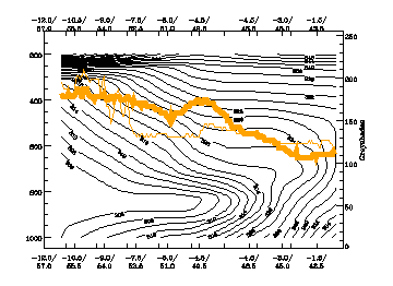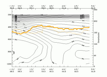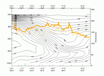 The left image above shows the decay zone of the Cold Front over the Atlantic. The selected vertical cross section is indicated by a white line and is also shown in the right image. The selection of the isentropic surfaces was made in order to get the best impression of the inflow at low and middle levels (316K) of the frontal gradient zone, as well as to get information about the behaviour of the warm conveyor belt at high levels (322K) within and above the frontal zone.