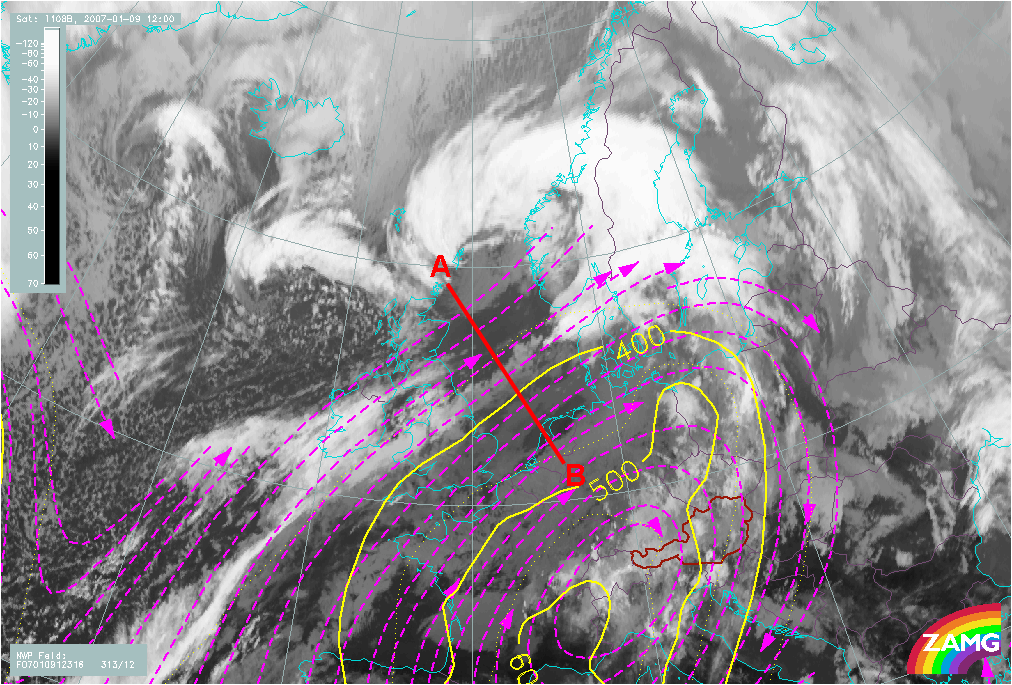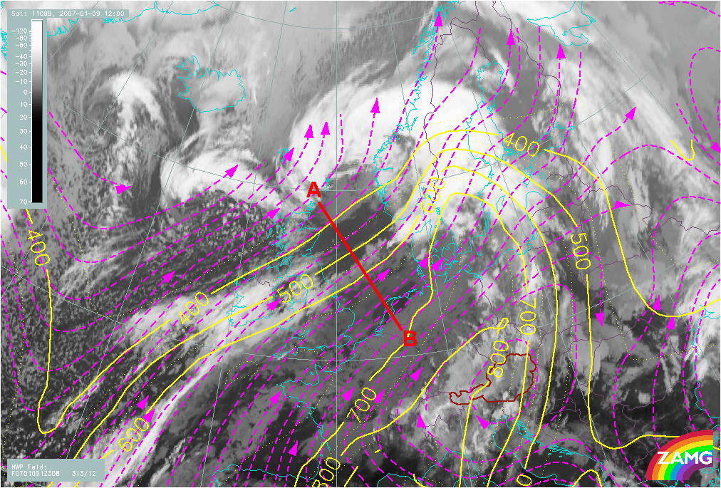 09 January 2007/12.00 UTC - Meteosat 8 IR10.8 image; magenta: relative streams 308K - system velocity: 313° 12m/s, yellow: isobars 308K; position of vertical cross section indicated
