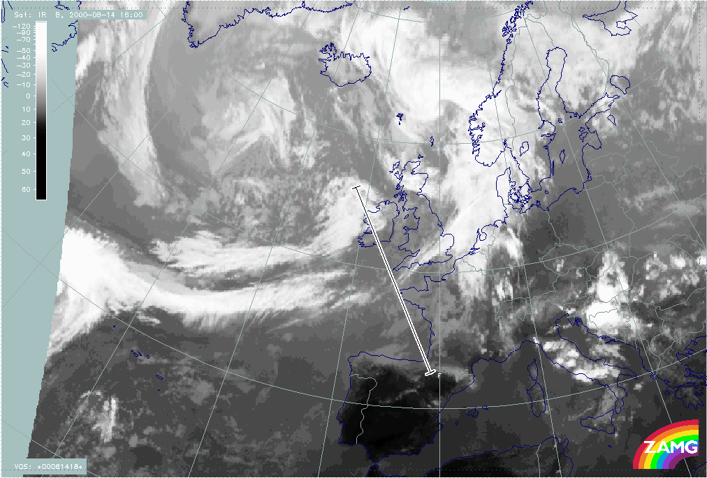 14 August 2000/18.00 UTC - Meteosat IR image; position of vertical cross section indicated