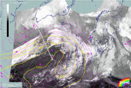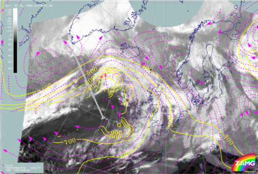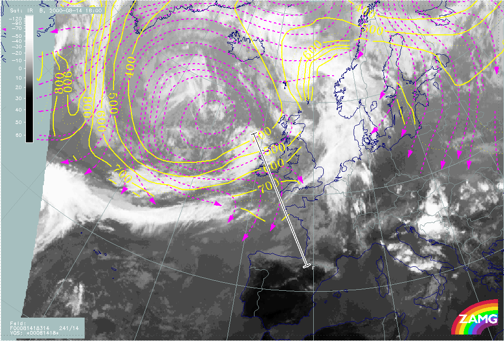 14 August 2000/18.00 UTC - Meteosat IR image; magenta: relative streams 314K - system velocity: 241° 14m/s, yellow: isobars 314K, position of vertical cross section indicated vertical cross section indicated