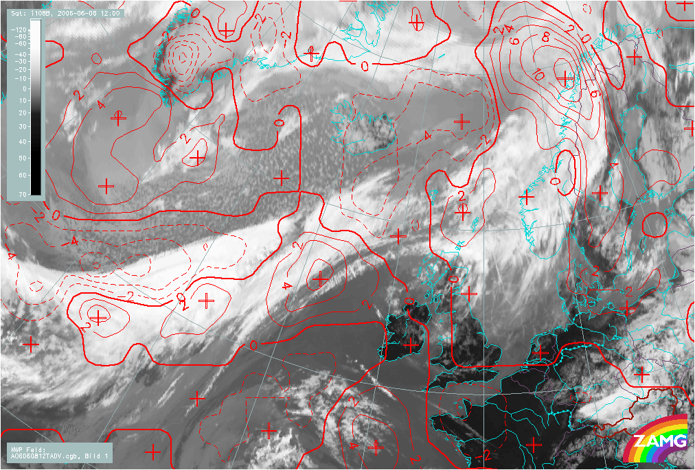 08 June 2006/12.00 UTC - Meteosat 8 IR10.8 image; red dashed: temperature advection - CA 700 hPa, red solid: temperature advection - WA 700 hPa