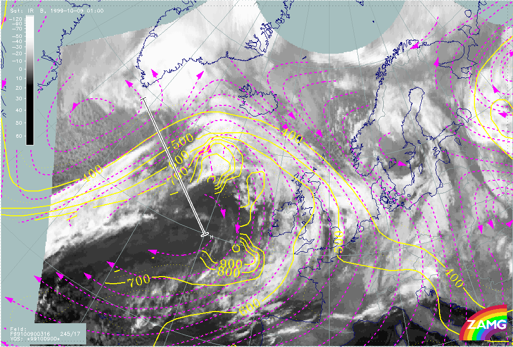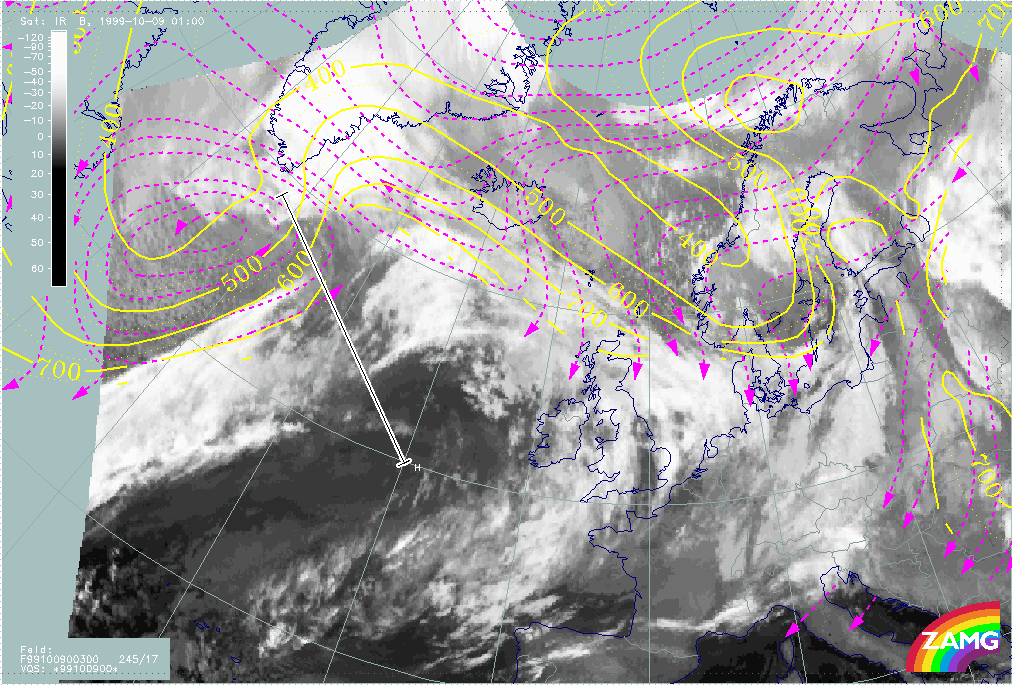 09 October 1999/01.00 UTC - Meteosat IR image; magenta: relative streams 300K - system velocity: 245° 17m/s, yellow: isobars 300K, position of vertical cross section indicated