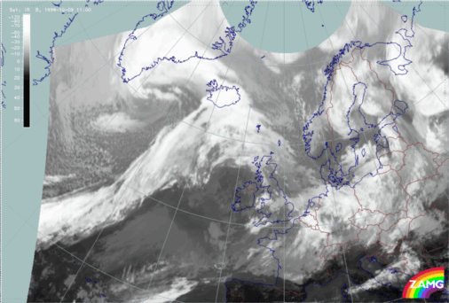 The right image above shows a sinking warm conveyor belt at the isentropic surface of 318K, which lies within the frontal gradient zone and inclined from about 400 hPa down to about 800 hPa over the area of the front decay. This situation results in a nearly complete dissipation of the cloud band, as seen in the IR10.8 image over Western France, some 12 hrs later (image below).