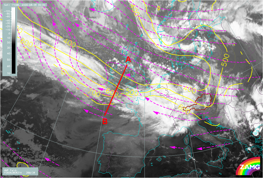 28 August 2006/06.00 UTC - Meteosat 8 IR10.8 image; magenta: relative streams 318K - system velocity: 289° 36m/s, yellow: isobars 318K; position of vertical cross section indicated