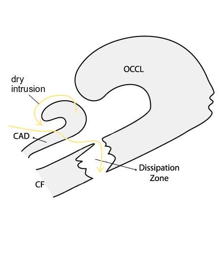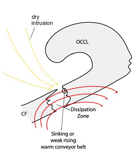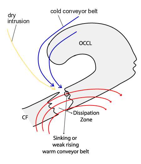• A sinking relative stream (a cold conveyor belt or a dry intrusion) can be detected which flows at nearly right angles to the frontal cloud band at low to middle levels, leading to the characteristic decay of cloudiness.