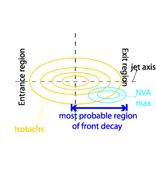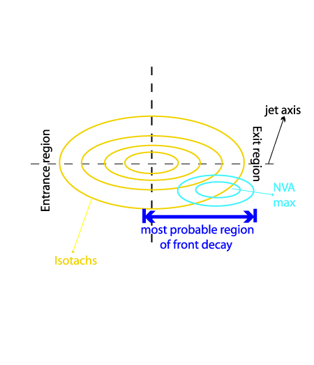 Another aspect of the physical meteorological background relates to the upper level jet streak, and is described in the chapter addressing the conceptual model "front intensification by jet". Regarding the position to the jet streak, it is well known that the right entrance region and the left exit region are areas of frontal intensification combined with positive vorticity advection at high levels, with convergence and distinct upward motion at low and mid levels. On the other hand the left entrance region and the right exit region should lead to frontolysis or at least cloud dissolution in connection with negative vorticity advection at high levels, divergence and downward motion in middle levels.
