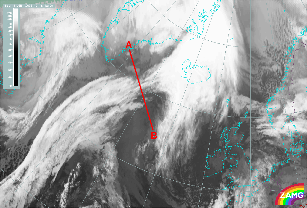 18 December 2006/12.00 UTC - Meteosat 8 IR10.8 image; position of vertical cross section indicated