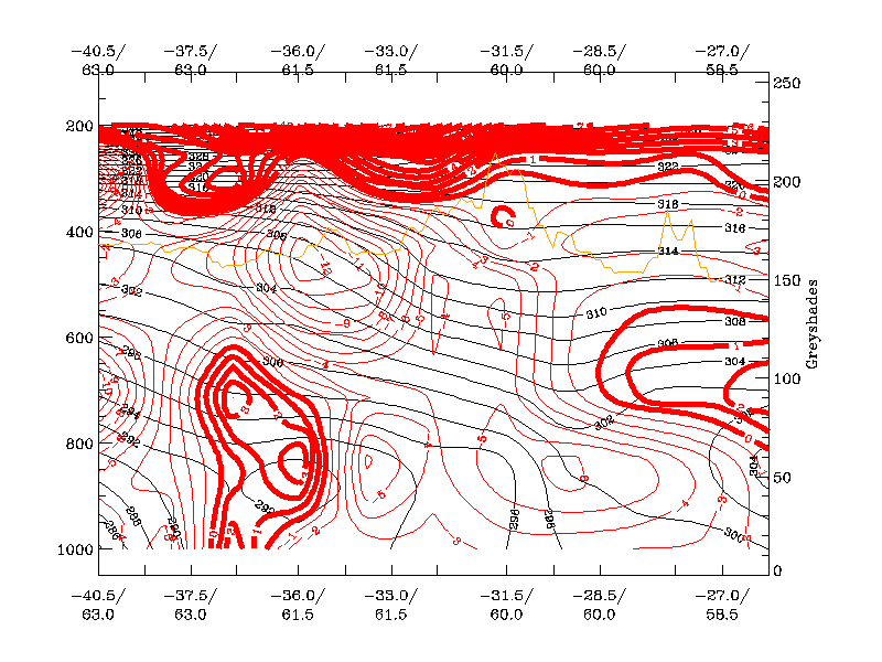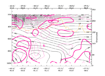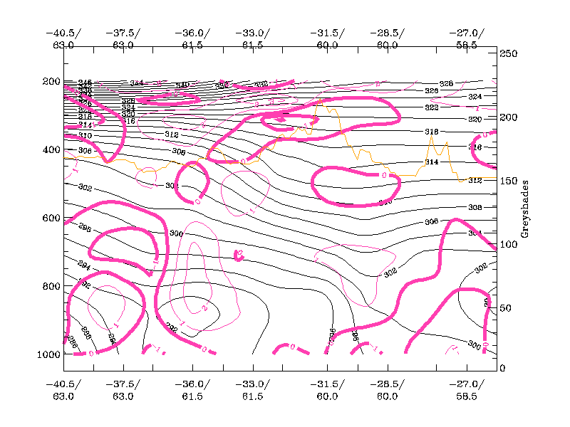 18 December 2006/12.00 UTC - Vertical cross section; black: isentropes (ThetaE), magenta thin: divergence, magenta thick: convergence, orange thin: IR pixel values