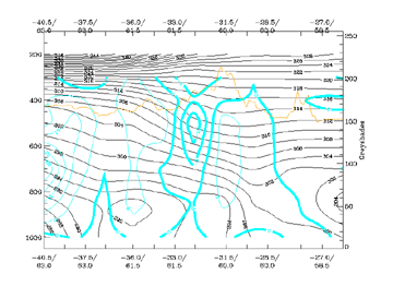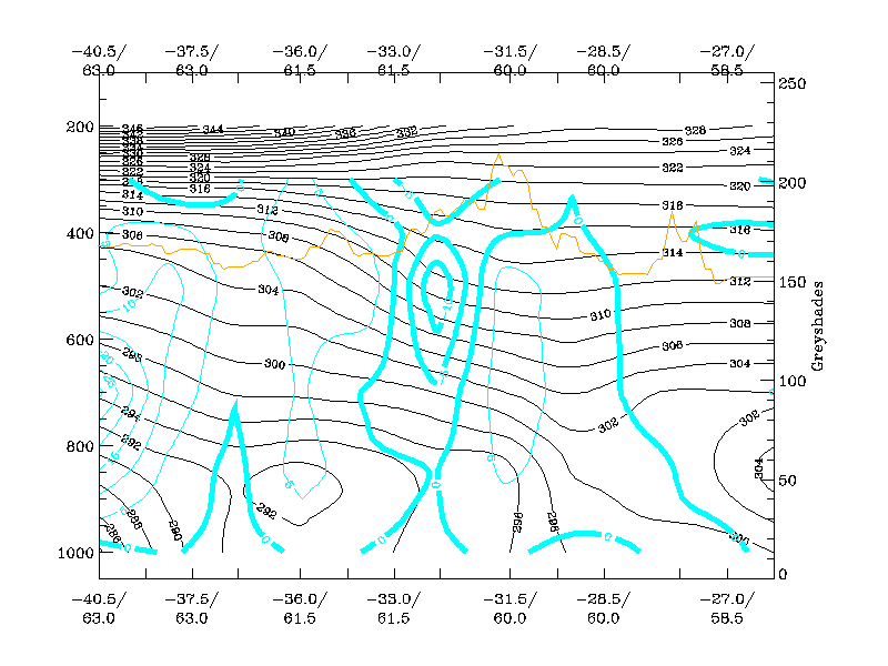 18 December 2006/12.00 UTC - Vertical cross section; black: isentropes (ThetaE), cyan thick: vertical motion (omega) - upward motion, cyan thin: vertical motion (omega) - downward motion, orange thin: IR pixel values