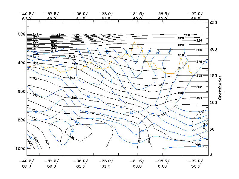 18 December 2006/12.00 UTC - Vertical cross section; black: isentropes (ThetaE), blue: relative humidity, orange thin: IR pixel values