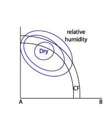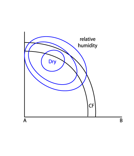 • The relative humidity has a minimum at high and middle levels, which can be interpreted as dry (cold) descending air within the frontal zone