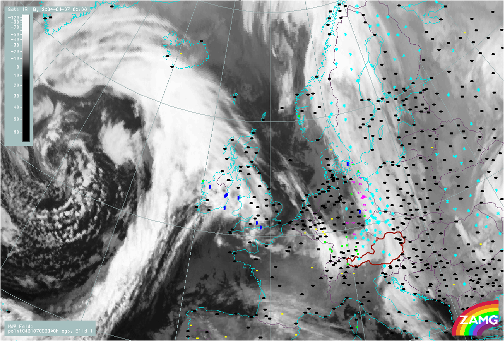 07 January 2004/00.00 UTC - Meteosat IR image; weather events (green: rain and showers, blue: drizzle, cyan: snow, red:
