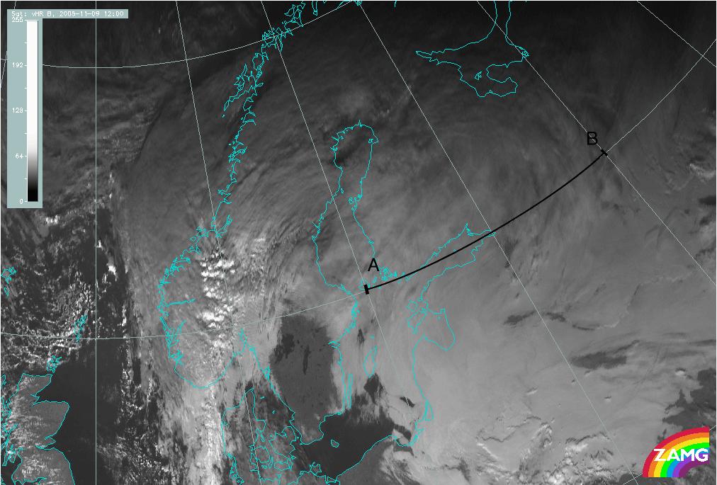 09 November 2005/12.00 UTC - Meteosat 8 HRV image; position of the Vertical Cross Section indicated