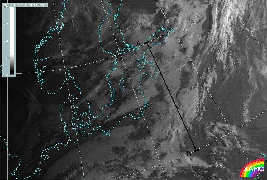 04 October 2005/06.00 UTC - Meteosat 8 HRV image; position of the Vertical Cross Section indicated