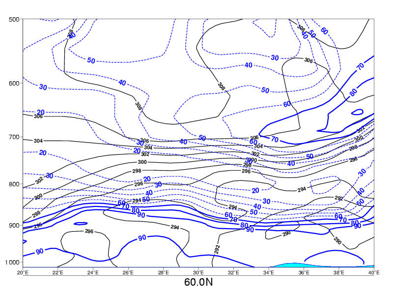 04 October 2005/06.00 UTC - Vertical cross section; blue: relative humidity