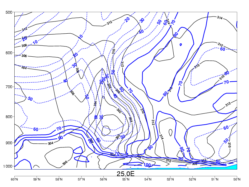 09 November 2005/12.00 UTC - Vertical cross section; blue: relative humidity