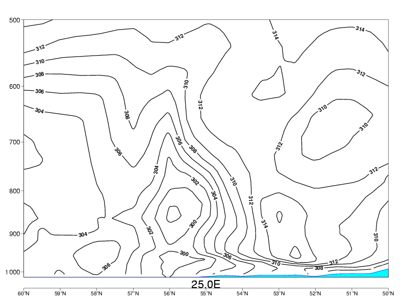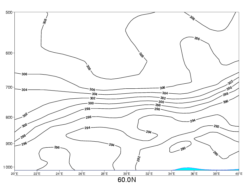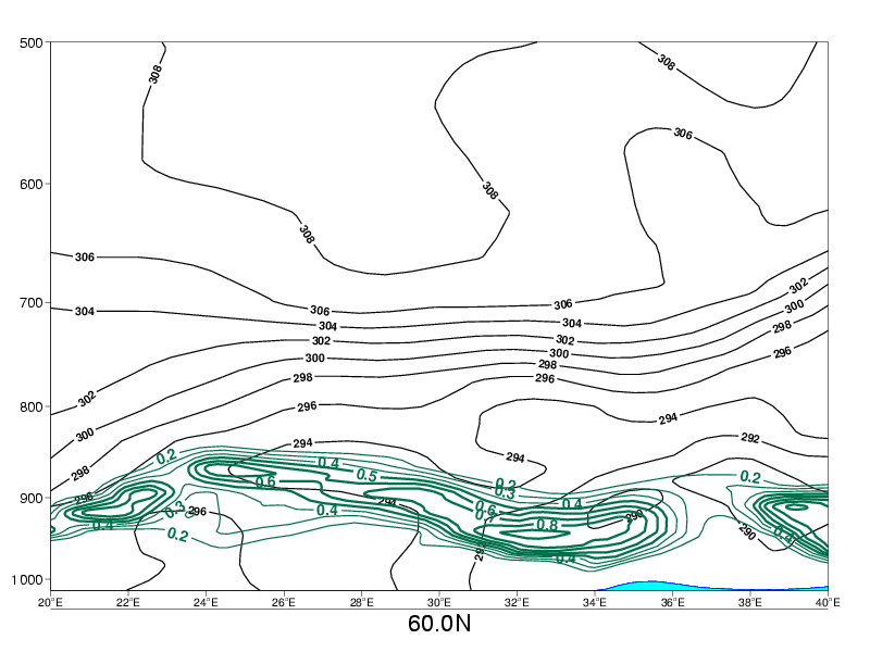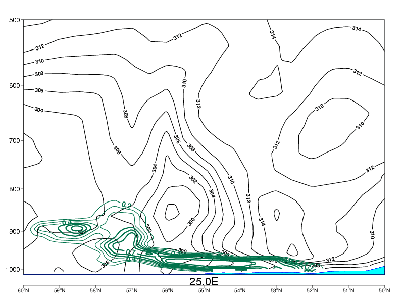 04 October 2005/06.00 UTC - Vertical cross section; black: isentropes