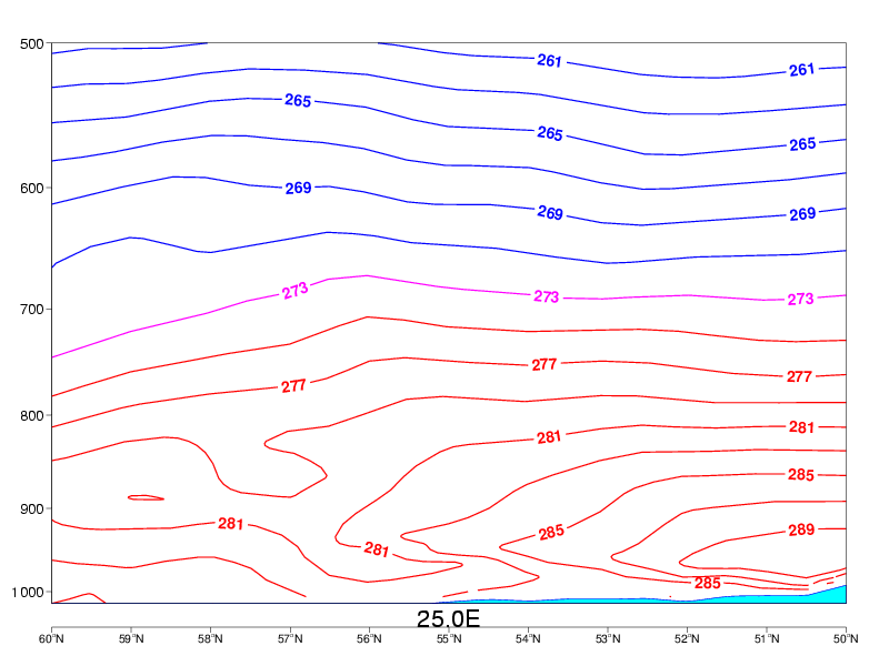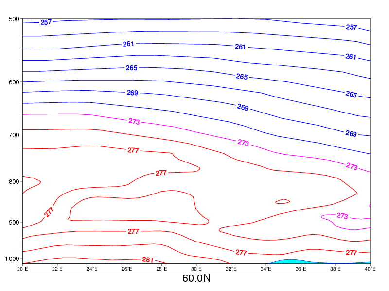 04 October 2005/06.00 UTC - Vertical cross section; red, magenta, blue: temperature
