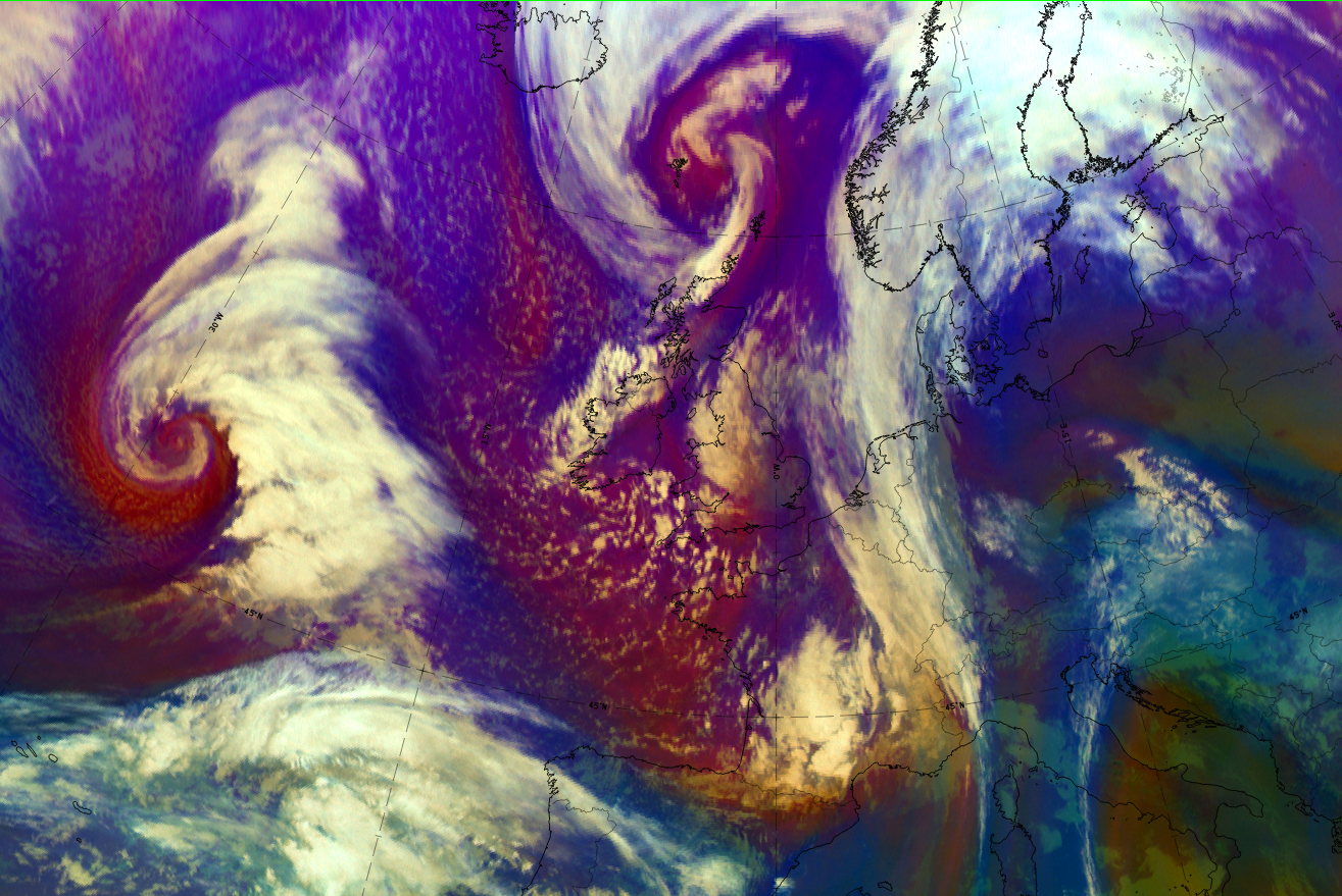 | Airmass RGB | Blue colours behind the cold front cloud band indicate cold air; dark brown more to the west shows the cold and dry air; the inst. occl. spiral is overrun by the dry air and therefore is displayed in the image as light brownish colours. |