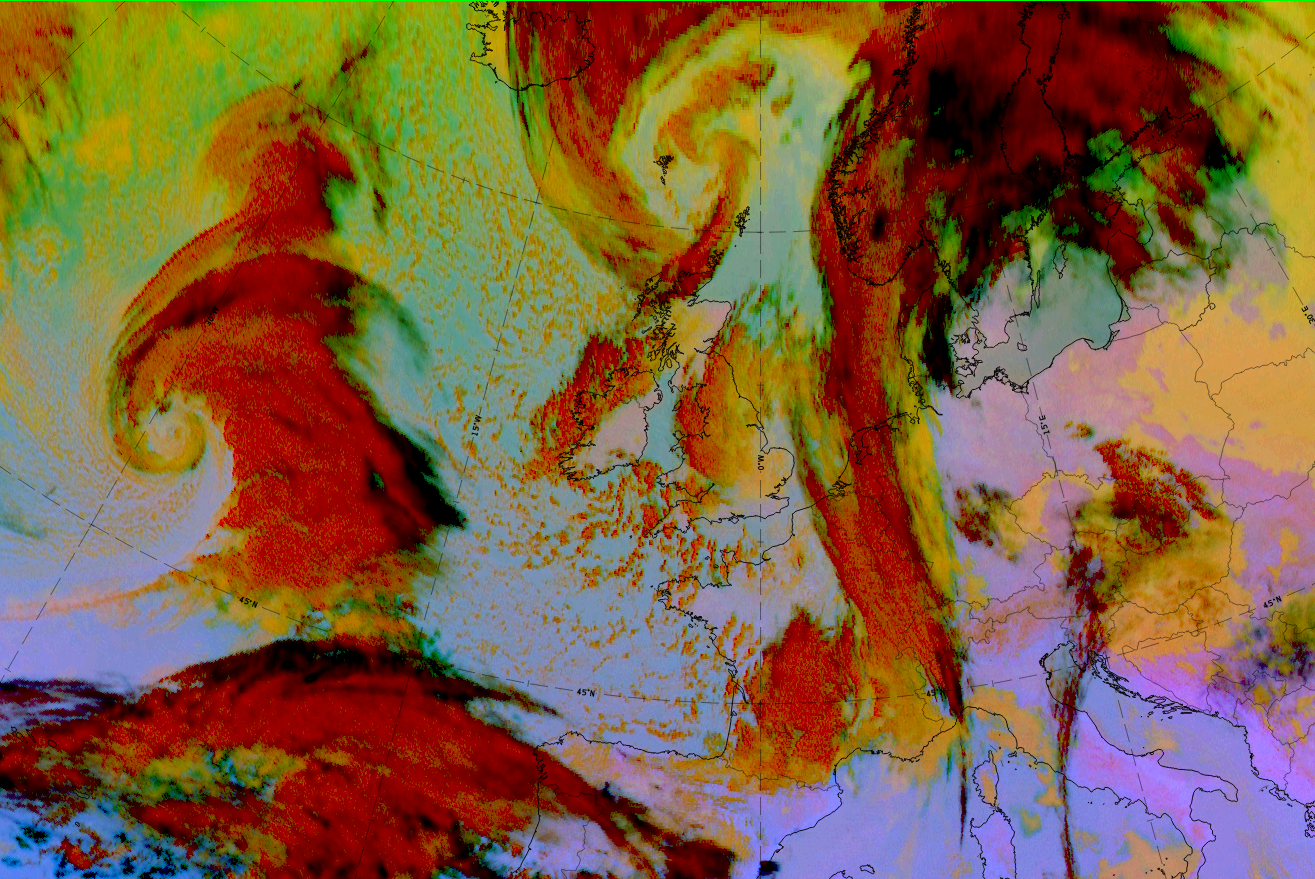 | Dust RGB | Dark red colours indicate the thick ice cloud in the cold front band as well as in some parts of the inst. occl. spiral; in the mergence area and the largest part of the spiral, the ochre colour represents mid- level cloud. |