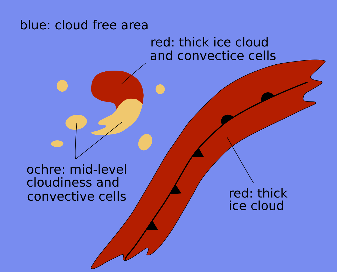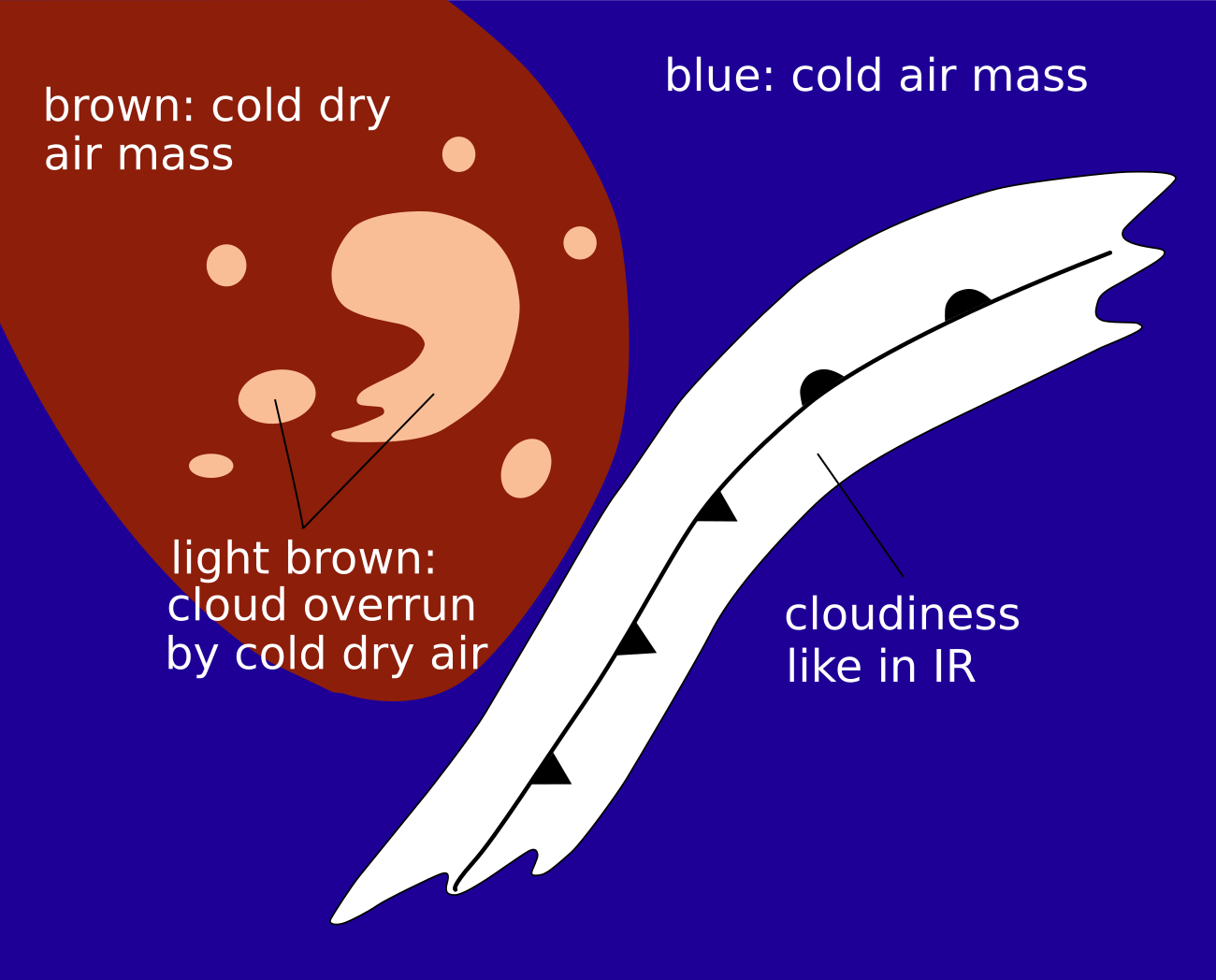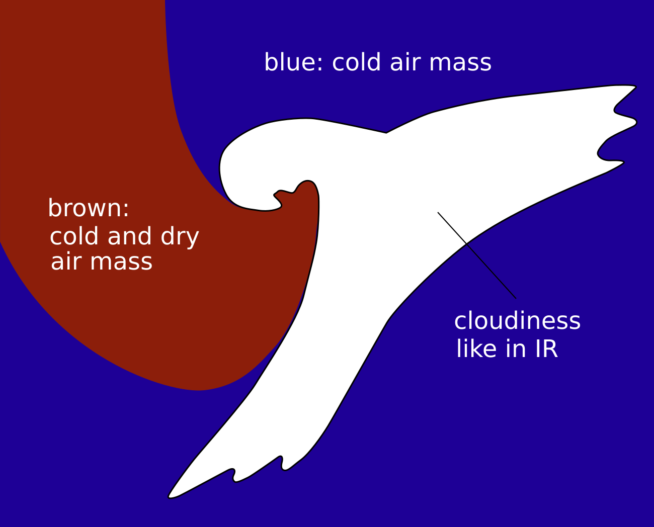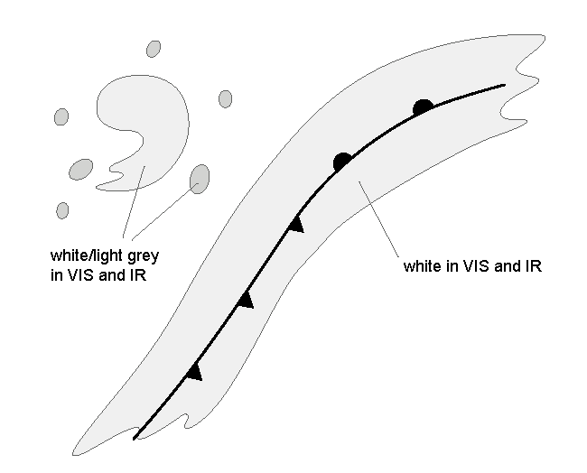 - VIS and IR: In the initial, separate comma stage, the frontal cloud band is white and the Comma cloud and the surrounding convective cloudiness are white to light grey. In the final, merged stage, the whole cloud system is white.