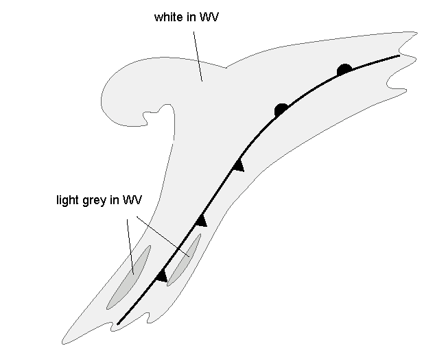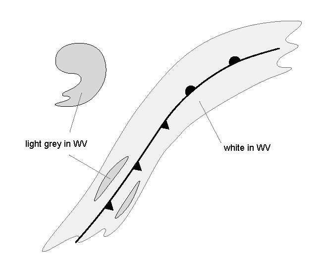 | WV | Cold front cloud band light grey indicating high upper level humidity; mergence area and inst. occl. spiral darkgrey. |