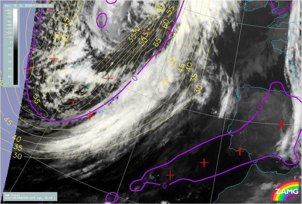 06 November 2003/06.00 UTC - Meteosat IR image; yellow: isotachs, violet: zero line of shear vorticity 300 hPa