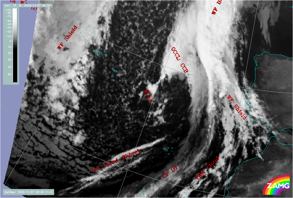 07 November 2003/06.00 UTC - Meteosat IR image; SatRep overlay: names of conceptual models