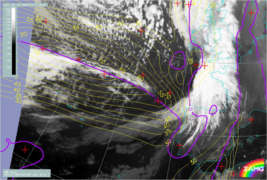 11 November 2003/18.00 UTC - Meteosat IR image; yellow: isotachs, violet: zero line of shear vorticity 300 hPa