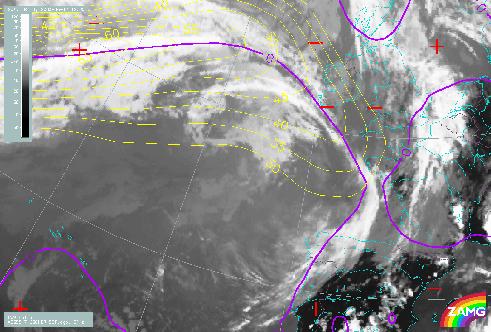 17 June 2003/12.00 UTC - Meteosat IR image; yellow: isotachs, violet: zero line of shear vorticity 300 hPa