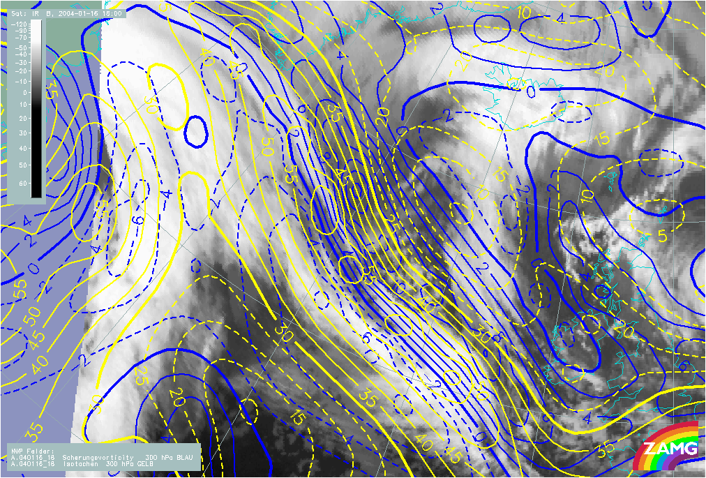 16 January 2004/18.00 UTC - Meteosat IR image; yellow: isotachs, blue: shear vorticity 300 hPa
