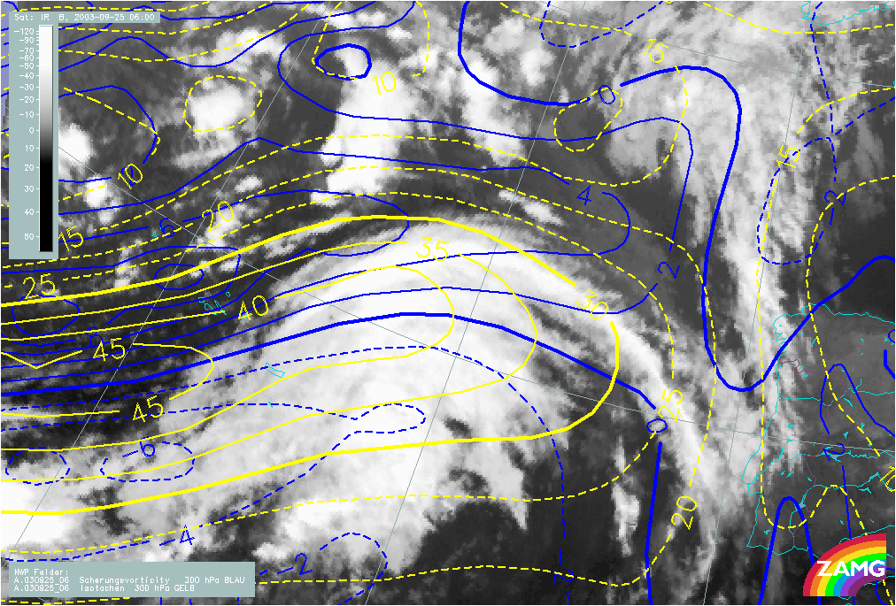 25 September 2003/06.00 UTC - Meteosat IR image; yellow: isotachs, blue: shear vorticity 300 hPa