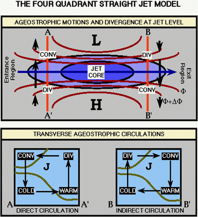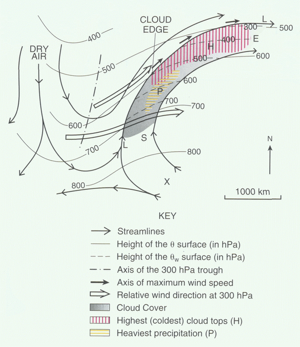 According to theory, a jet stream flows around the Warm Front Shield, with the frontal cloud band lying on the anticyclonic side of the jet axis. Supporting the theory, there are also observations from WV images in which there is a Dark Stripe along the pole ward edge of the frontal cloud band. Jet fibres develop on the anticyclonic side of the jet.