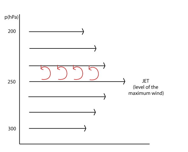 Taking into account the vertical wind shear, directly above the jet core there is also upward motion on a smaller (turbulence) scale.