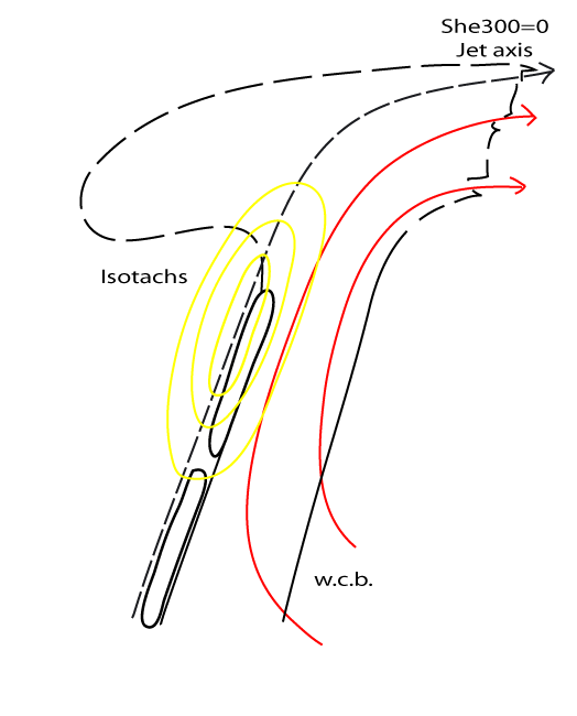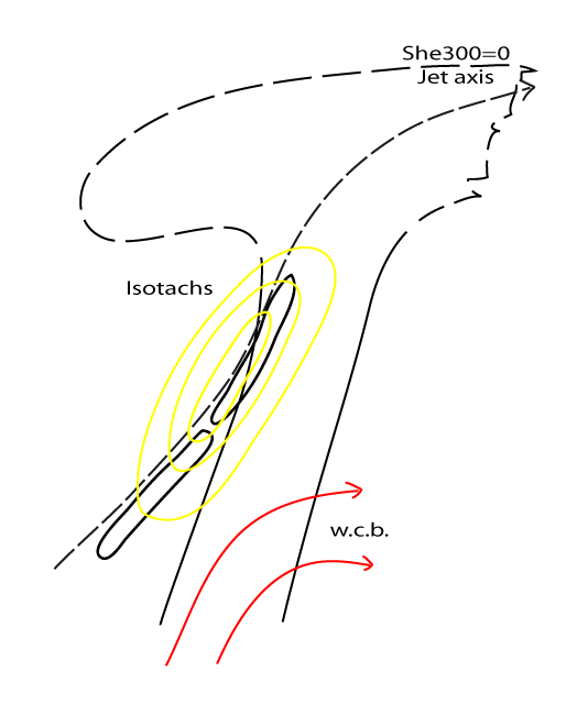 The above image shows the example of Jet Fibres developed behind a Cold Front overlaid with isotachs greater than 30 m/s and the zero line of shear vorticity at 300 hPa. The fibres occur along the zero-line of shear vorticity in the entrance region of the jet streak.