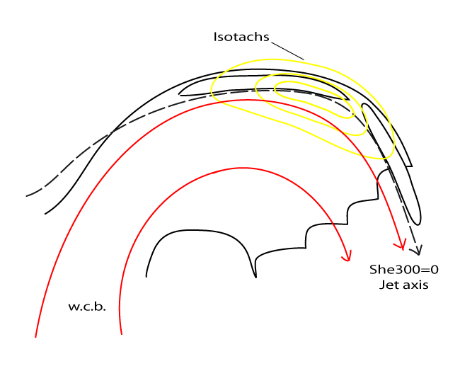 Besides the smaller scale mechanisms responsible for the formation of Jet Fibres already mentioned in the case of the Cold Front, there is also an influence of the sharply curving jet stream. When the jet is curved, shear caused by the change of the wind speed is increased by the shear resulting from the change in wind direction.