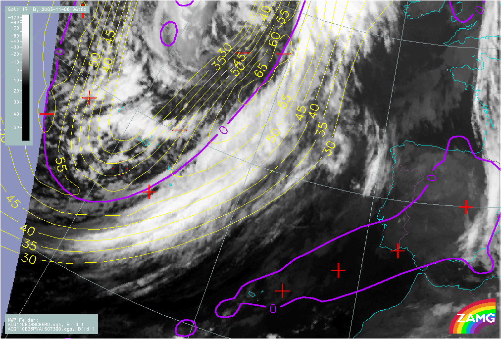 06 November 2003/ 06.00 UTC - Meteosat IR image, yellow: isotachs, violet: zero line of shear vorticity 300 hPa