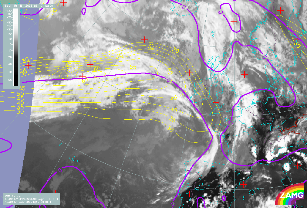 17 June 2003/12.00 UTC - Meteosat IR image; yellow: isotachs, violet: zero line of shear vorticity 300 hPa