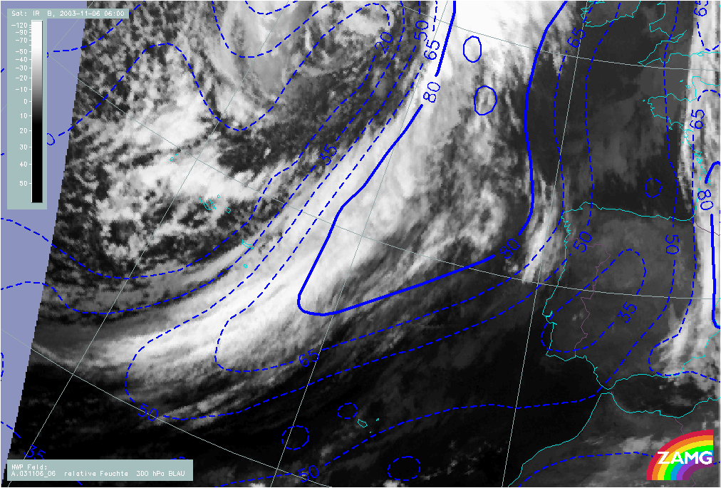 06 November 2003/06.00 UTC - Meteosat IR image, blue: relative humidity at 700 hPa