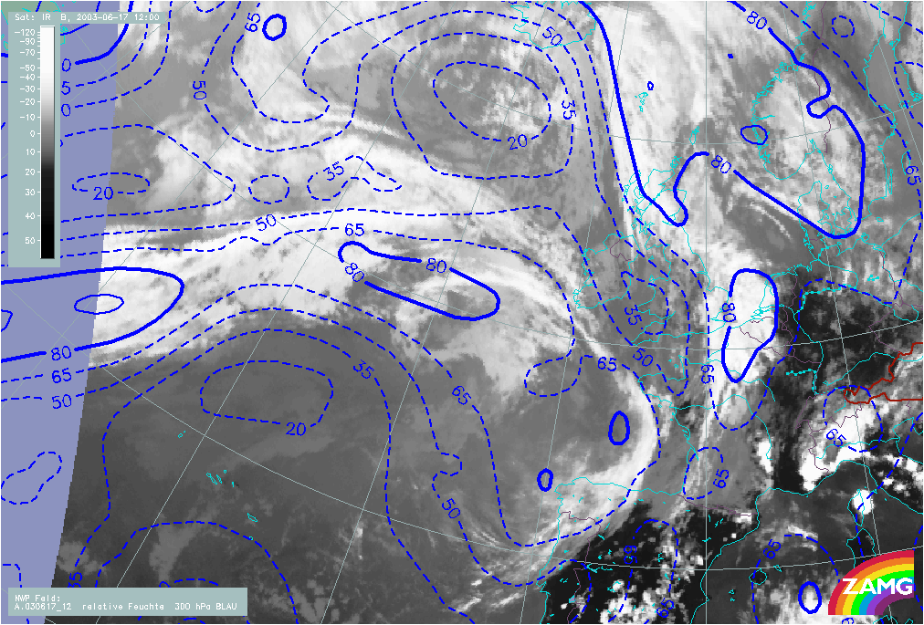 17 June 2003/12.00 UTC - Meteosat IR image, blue: relative humidity