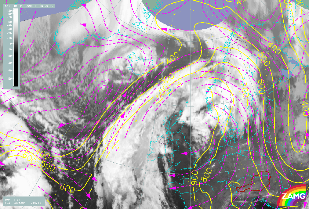 05 November 2003/06.00 UTC - Meteosat IR image; magenta: relative streams 304K - system velocity 216° 12 m/s; yellow: isobars