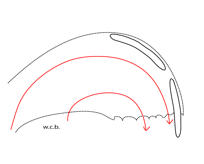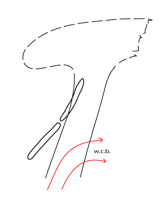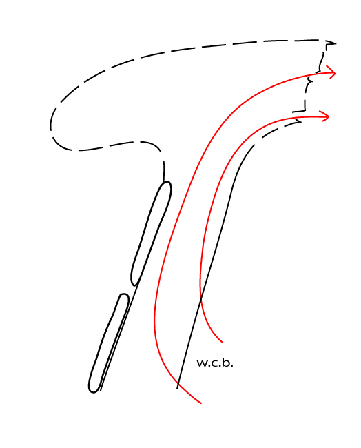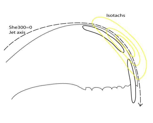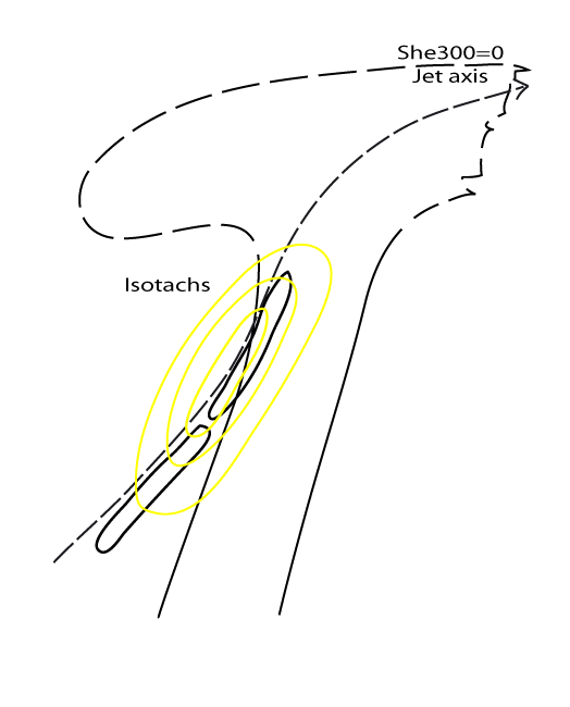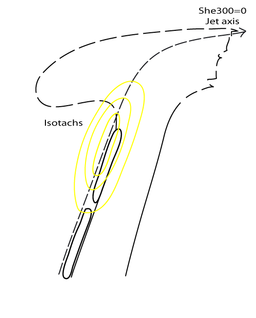 The diagrams above show the location of wind maximum and zero-line of shear vorticity behind Ana and Kata Cold Fronts. Fibres form in the entrance region or adjacent to the jet streak.