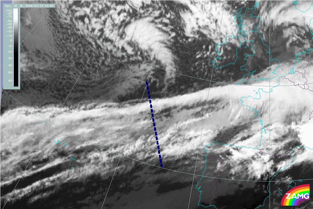 13 January 2004/12.00 UTC - Meteosat IR image; position of vertical cross section indicated from north to south