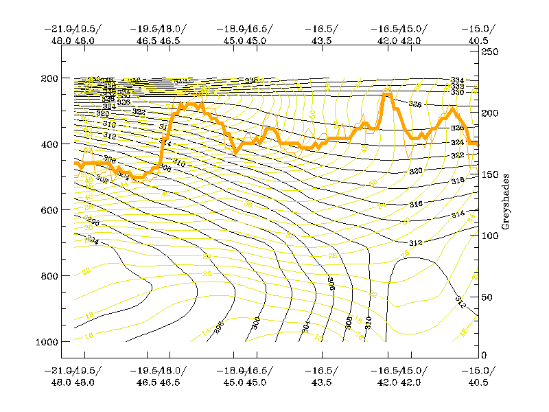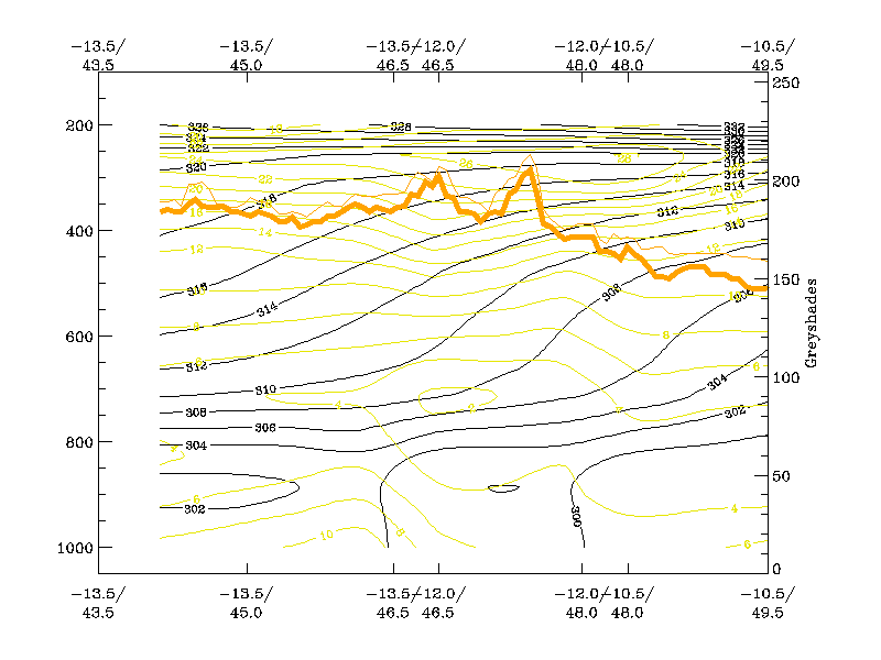 16 February 2004/12.00 UTC - Vertical cross section; black: isentropes (ThetaE), yellow: isotachs, orange thin: IR pixel values,
