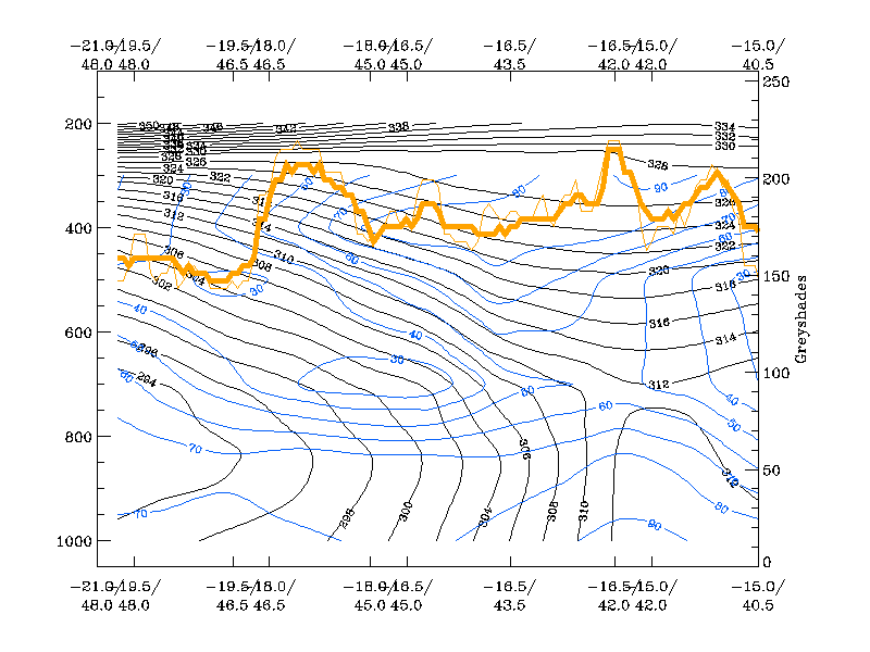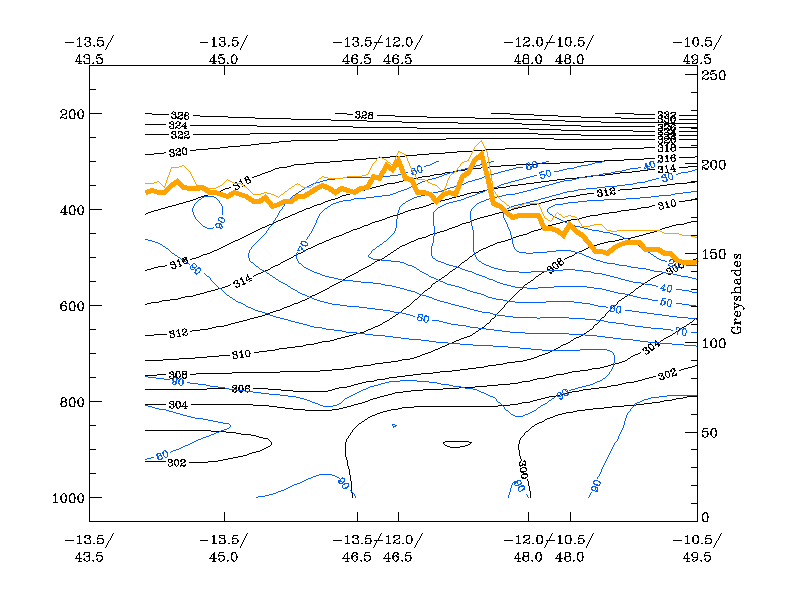 16 February 2004/12.00 UTC - Vertical cross section; black: isentropes (ThetaE), blue: relative humidity, orange thin: IR pixel